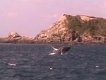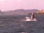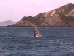 そのクジラのウオッチングを楽しんだ後、一度港に戻りお客さんを乗せて午前のウオッチングに出掛けました。早朝と同じ位置で他の船がクジラをキープしていたのでそれを見に行ったのですが、この時のクジラのパフォーマンスはイマイチ。しかしふと遠くを見ると別の船がウオッチングをしていて、そちらのクジラが頭を海面に出すスパイホップをしているのが見えたので浮気心を出し急遽そちらのクジラに向かいました。しかしこのように浮気心を出すと大抵の場合、失敗することが多いらしいのですが、今回の場合はこれがまたまた大当たり。遠くから見えたスパイホップを2匹のクジラが同時にする、いわゆる「ダブル・スパイホップ」を見せてくれました。(^o^) しかしこれもいきなりだったので残念ながらビデオは撮る事は出来ませんでしたが、この時以外でもスパイホップを見せてくれたので、そちらは何とか撮る事が出来ました。またスパイホップだけではなく、体を横にしてヒレやテールを見せたり、船の近くで仰向けになってお腹を見せてくれたりもしました。