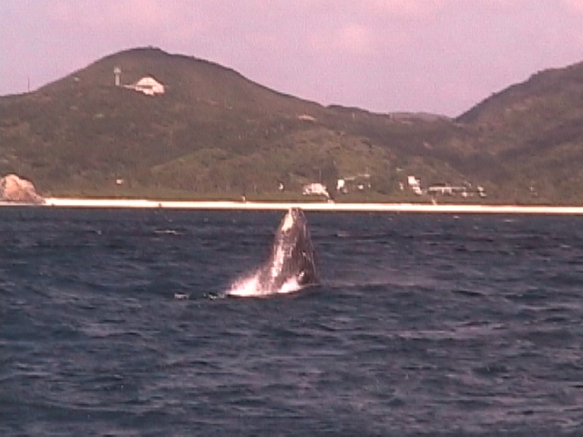 午後のダイビングも午前中と同じく渡名喜曽根へウオッチングに行ってたのですが、雨が少し強くなって来てビデオが撮りにくくなり、またクジラのパフォーマンスもイマイチでしたが、この日の午前中のウオッチングも最高で大当たりでした。\(^O^)/