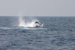 この日の天気はすごく良い晴天だったのですが、少し風があり、海上にもちょっと波がありました。そのため数名のお客さんが船酔いでダウンしてしまう程でした。風が南風だったので、出掛けたのは渡名喜曽根方面、そこでは既に数隻の船がウオッチングをしていました。我々も早速ウオッチングを開始。程なくして2匹のクジラが胸ビレを見せてくれたり、ペックスラップ等のパフォーマンスを見せてくれました。(^o^) そのパフォーマンスが収まった後、少し遠くにいたクジラがブリーチ! それを見てそっちのクジラの方に向かったのですが、そちらに向かう途中、つい先ほどまで見てたクジラが3頭連続ブリーチ! 清さんの新艇の後方で後ろを向いて座っていた僕はその3連発をバッチリ見ましたが、いきなりだったのといかんせん遠かったので、とてもビデオや写真は撮れる様な状況ではありませんでした。そして我々が向かったクジラはその後跳ぶ事はありませんでした。。。(T.T) しかし今年も最初からまあまあの当たりで幸先良し!かなと思った次第でした。(^^)